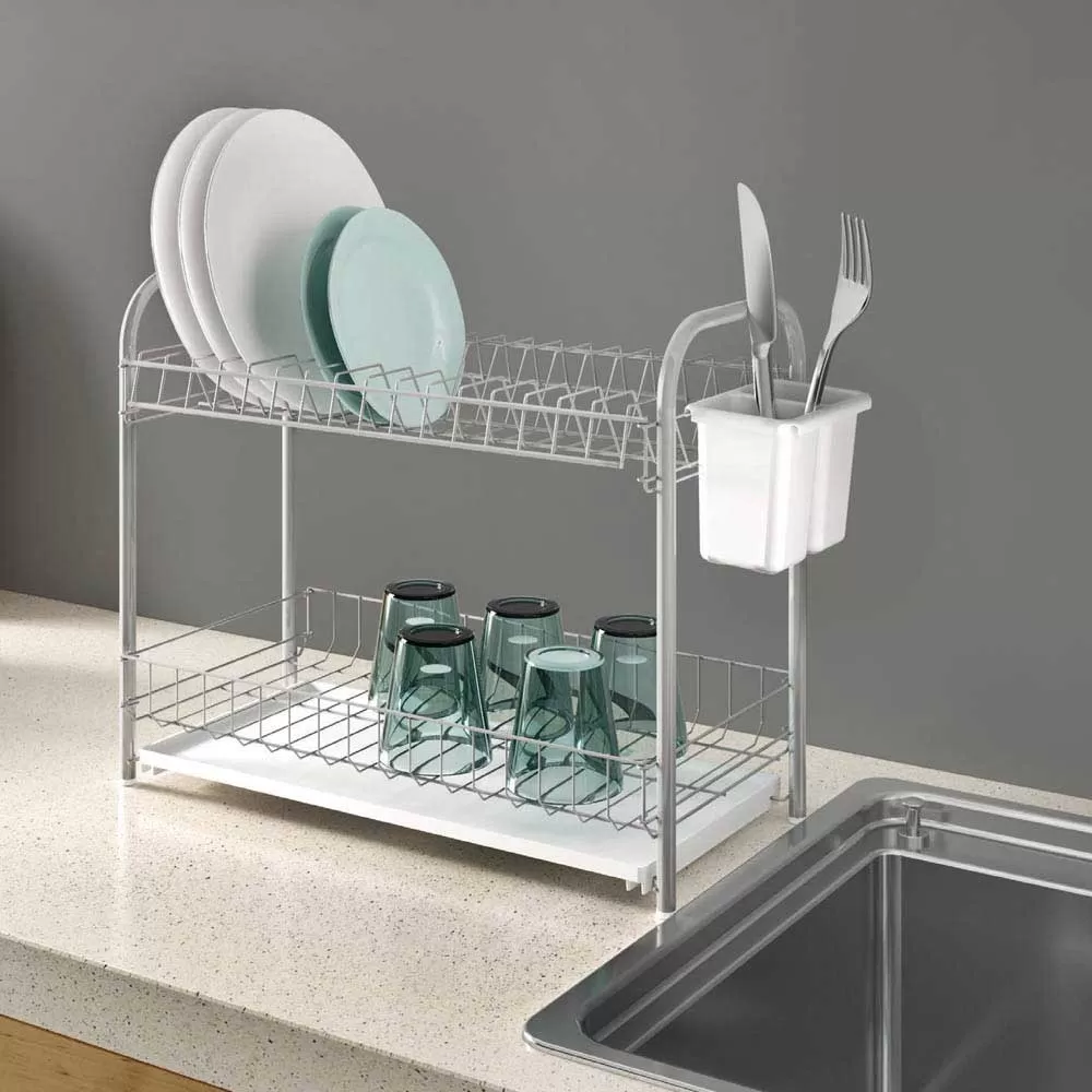 Stalak za sušenje posuđa sa dva nivoa. Donji nivo je ravan i idealan za činijice i čaše, dok je gornji prilagođen za slaganje tanjira. Sa bočne strane je posuda za escajg.