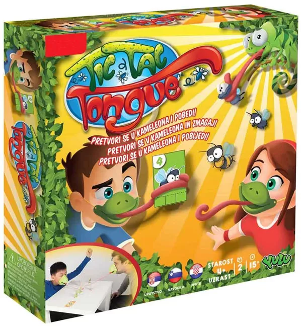 Set sadrži: 2 maske kameleona, 2 jezika, 10 meta, 10 kartica i uputstvo