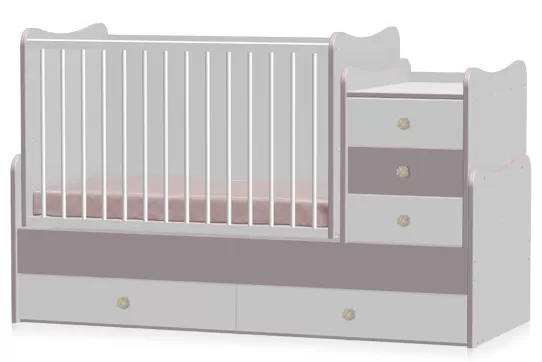 Transformiše se u trodelni set za stariju decu (klasičan krevet, komodu i radni sto) ili trodelni set za dvoje dece (krevet za starije dete, krevetac za bebu i komodu) - pogledati video prezentaciju u okviru opisa proizvoda