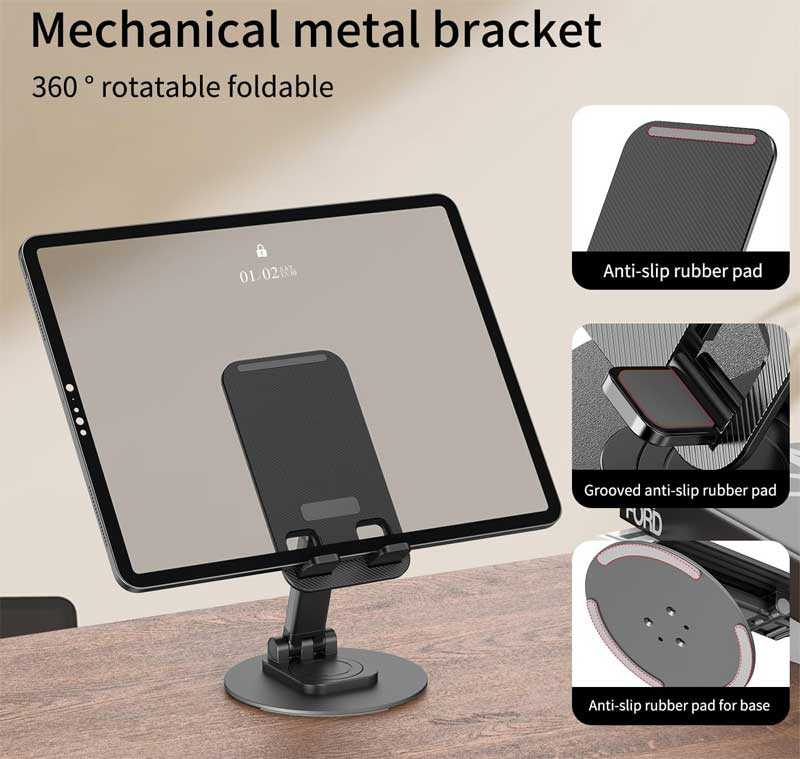 Univerzalni stoni držač za telefon i tablet kompatibilan je sa svim uređajima do 12.9 inča. Ugao gledanja i visina držača se jednostavno podešavaju, a baza se rotira za 360 stepeni. Silikonske podloge na mestima oslonca sprečavaju klizanje.