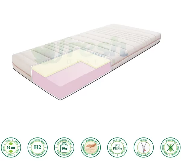 Dušek srednje tvrdoće sa jezgrom od pene. Dimenzije dušeka su 200x150x16cm. Ima antibakerijsko dejstvo. Preporučuje se za osobe težine do 80kg. Posebna navlaka se skida radi pranja.