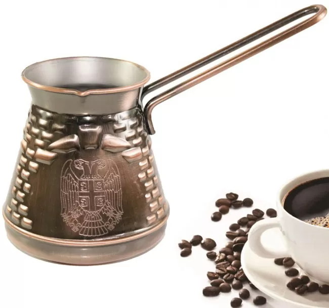 Bakarna džezva sa grbom Srbije. Zapremina ove džezve je 0.17 litara, dovoljna za jednu klasičnu šoljicu kafe.