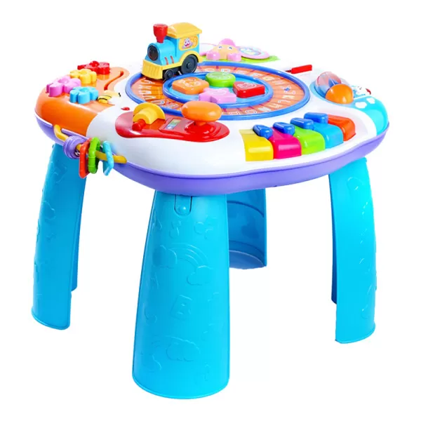 Više igračaka u jednoj - muzički klavir, zvečke, nizalice, umetaljka, vozić za učenje slova.... Multifunkcionalni stočić pogodan za vežbe koordinacije pokreta oka i ruku, vežbe logičkih i misaonih funkcija, početno učenje slova,...