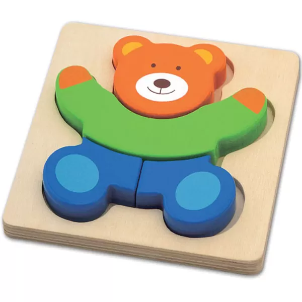 Sadrži drvenu figuricu mede i pozadinu u koju se uklapa kao puzzla.