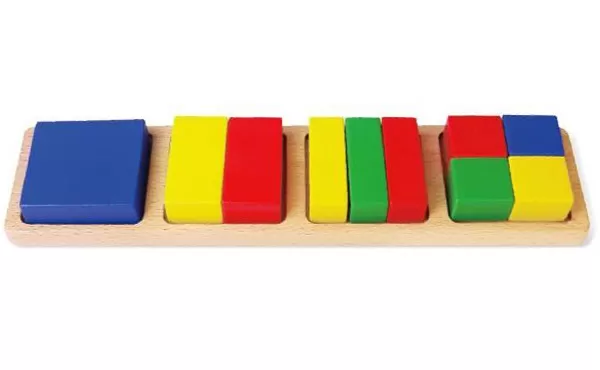 Drvena umetaljka, kvadrat, uz koju će deca lakše savladati pojam celog i njegove polovine, trećine i četvrtine.