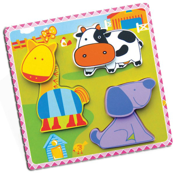 Edukativna slagalica - umetaljka sa dva nivoa zadatka i dva nivoa slaganja. Prvi zadatak je umetanje dela u celinu - popuni sliku - gde dete vežba opažanje, zaključivanje, koordinaciju i finu motoriku. Drugi zadatak je složiti dvodelnu figuru životinje.