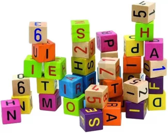 Drvene kocke različitih boja, sa brojevima i slovima. U setu se nalazi 40 kocki. Dimenzije svake kocke su 3.5x3.5x3.5 cm.