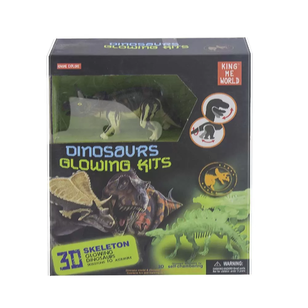 Set sadrži: figuru dinosaurusa i 3D kostur koji se sastavlja i svetli u mraku