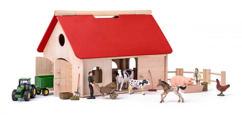 U pakovanju: ambar, traktor, farmer, farmerova žena, ručna kolica, korito, sanduk, metla, vile, seno, krava, tele, ždrebe, svinja, kokoška, uputstvo za sklapanje