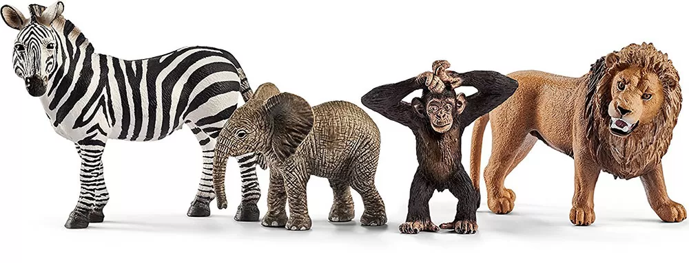 U pakovanju: 1 x lav, 1 x zebra, 1 x mladunče afričkog slona, 1 x mladunče šimpanze