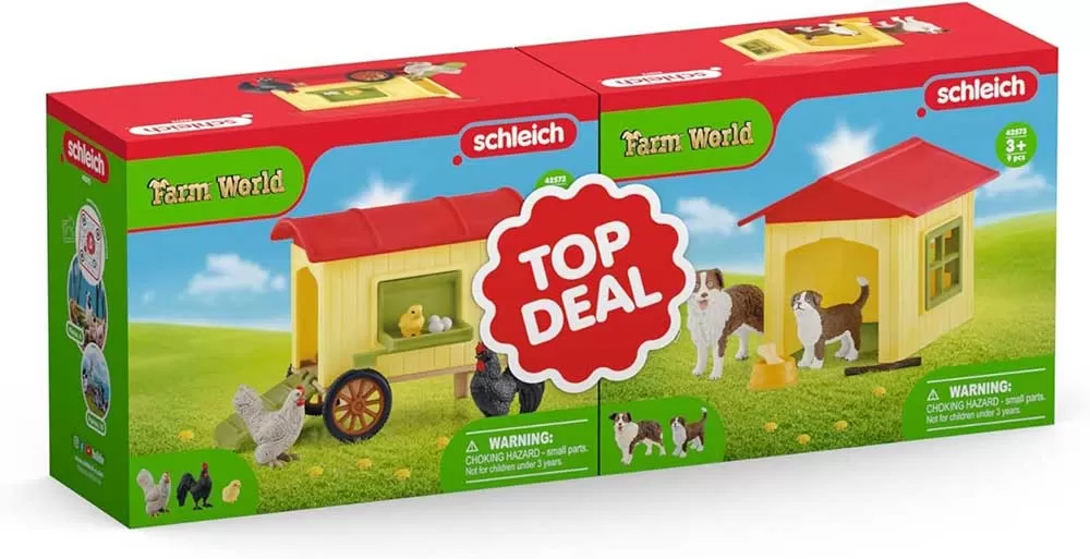 U pakovanju: 1x pokretni kokošinjac sa vratima, prozorom i policom, 1x petao figurica, 1x kokoška figurica, 1x pile figurica, 1x jaja, 1x kućica za pse, 1x pas australijski ovčar ženka, 1x pas australijski ovčar štene, 1x činija za psa, 1x koska, 1x štap
