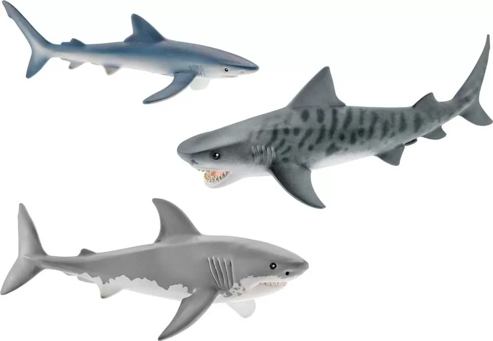 Pakovanje sadrži 1 figuricu bele ajkule, 1 figuricu plave ajkule, 1 figuricu tigraste ajkule
