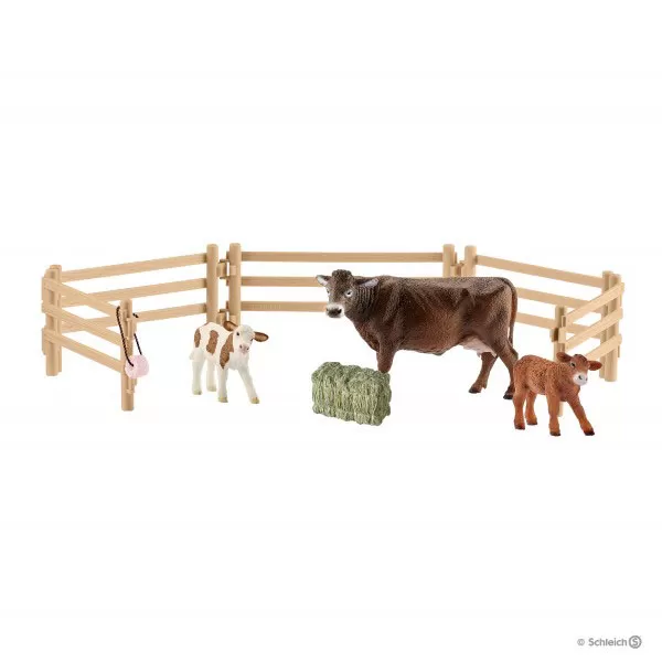 Pakovanje uključuje: 1 x tele simental, 1 x smeđe tele, 1 x smeđa krava, 5 x ograda, 1 x seno, 1 x slani kotur