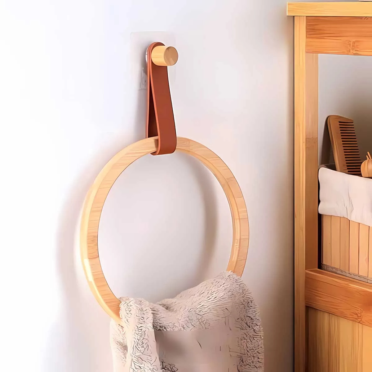 Okrugli Samolepljivi Nosač Za Peškire Bambus i Eko Koža - Montaža Bez Bušenja Braon