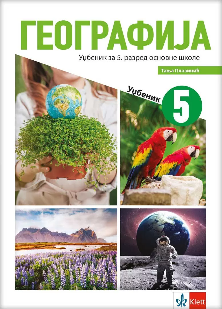 Udžbenik iz geografije za peti razred osnovne škole, odobren od strane Ministarstva prosvete. Autorka: Tanja Plazinić. Izdavač: Klett.