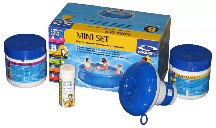 Komplet sadrži: 0.5 kg AQUAMULTI tablete od 20g - sadržaj hlor, algicid i flokulant 0.5 kg preparata PH MINUS - za smanjivanje ph vrednosti vode 1 kom AQUACHEK - set za analizu vode - meri hlor, brom i ph vrednost vode 1 mini plovni dozator za tablete