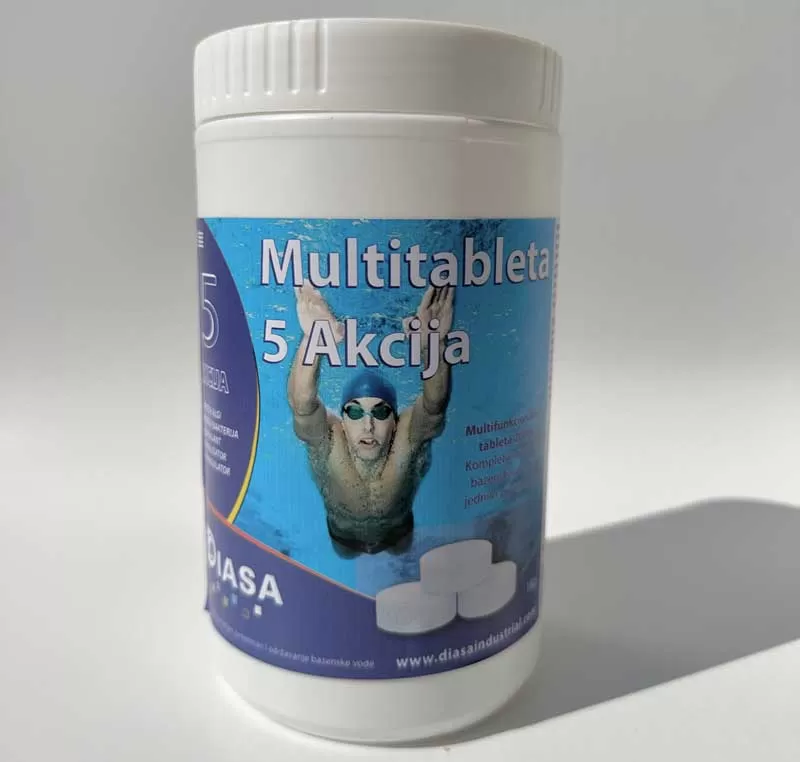 Višenamensko sredstvo za tretman vode u bazenima. 5 u 1 tablete. Algicid, sredstvo za dezinfekciju, fllokulant, stabilizator, sredstvo protiv bakterija. 1kg