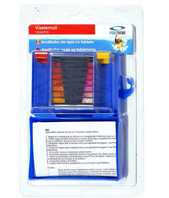 Set za analizu vode u bazenima. Brzo i jednostavno proverite pH vrednost i nivo hlora u vodi. Sadržaj seta je dovoljan za 10 merenja.