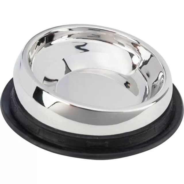 Činija od nerđajućeg čelika 0.7l posebno pogodna za pse sa kratkom njuškom zbog spuštene ivice na jednom delu. Ne kliza se, ima gumirano dno.