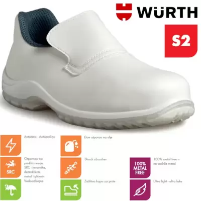 Plitke bezbednosne cipele savremenog dizajna, bele boje, sa S2 stepenom zaštite. Paropropusna, antibakterijska postava, zaštitna kapa za prste, PU...