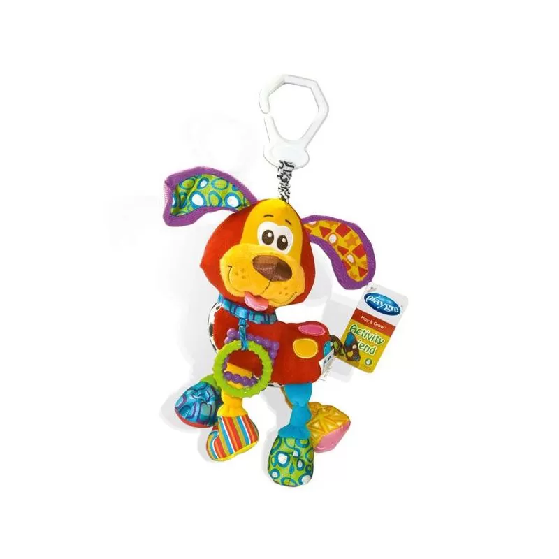 Vesela kuca kao kombinacija zvečke, glodalice ili otkrivalice raznih tekstura i materijala - pliš, pamuk, guma. Kuca je sa zakačaljkom.