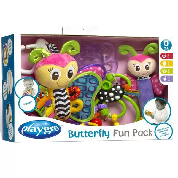 Leptir set idealan je poklon koji sadrži igračke koje stimulišu vizuelne i taktilne sposobnosti, gumena glodalica sa vodenim hladjenjem, olakšaće deci rast zubića jer njene rebraste površine nežno masiraju desni.