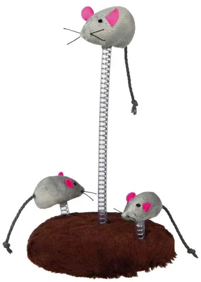 Postolje sa tri plišana miša na oprugama - sjajna zabava za mačke! Dimenzije ø 15 × 22 cm.