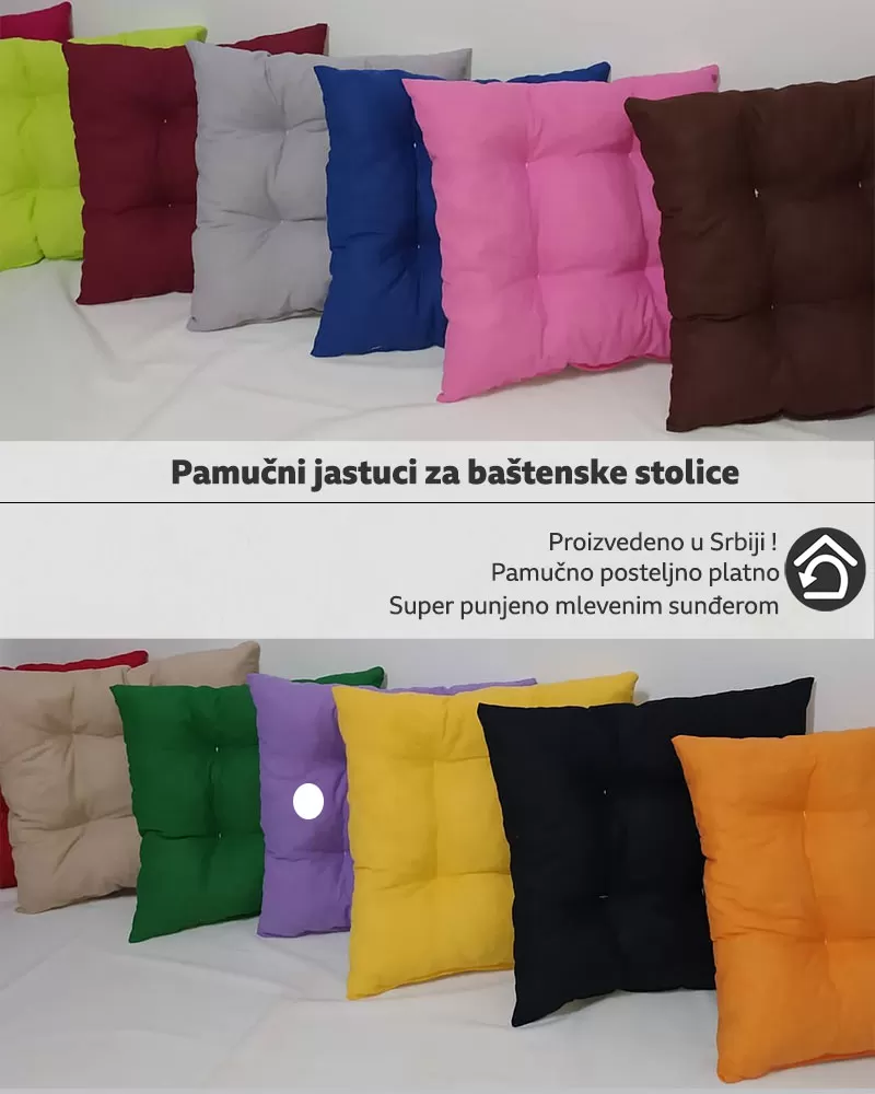 Udobna, kvalitetno napravljena sedalica dimenzija 50 x 50 cm. Napravljena je od pamučnog posteljskog platna, a punjena mlevenim sunđerom. Namenjena je za sve tipove baštenskih ili trpezarijskih stolica, dolazi sa vrpcama za fiksiranje.