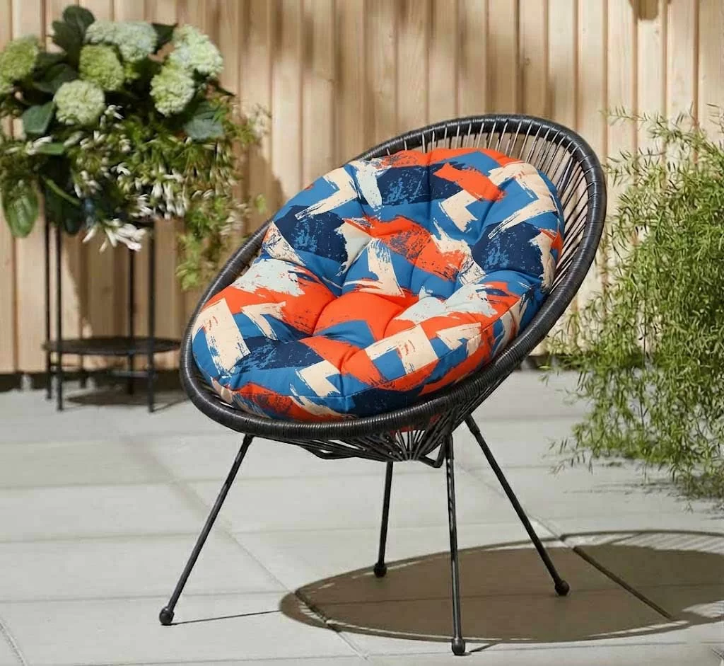 Jastuk za baštenske stolice - fotelje ovalnog oblika, dimenzija 110x90cm i debljine 15-20cm, štepan, sa vezicama. Ne pruža samo udobnost, već je i estetski dodatak, obogaćuje Vaš prostor svojim dizajnom.