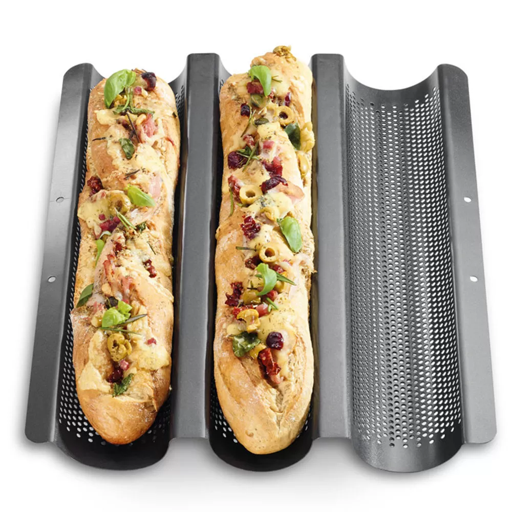 Posebno perforirani pleh sa kalupom za tri hrskava bageta od 250-300g. Visokokvalitetni čelični lim ravnomerno raspoređuje toplotu za savršen rezultat. Opremljen je nelepljivim premazom tako da se testo ne lepi za pleh.