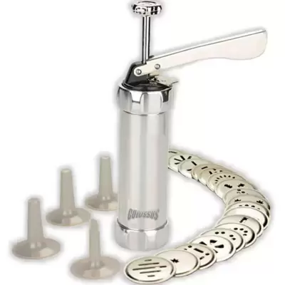 Presa za biskvite koju možete koristiti i za filovanje i ukrašavanje kolača i torti. Dolazi sa 20 kalupa za biskvite i 4 kalupa za krem.