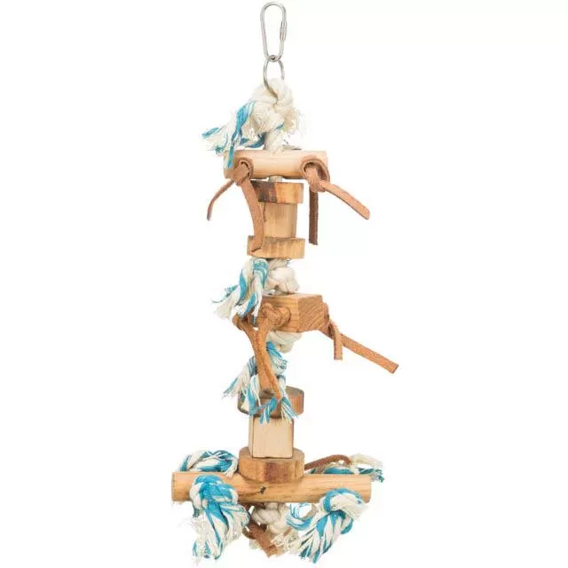 Igračka za papagaje i druge ptice Trixie napravljena je od drveta, pamučnog kanapa i kožnih tračica i namenjena je da visi u kavezu. Dugačka je 35cm.