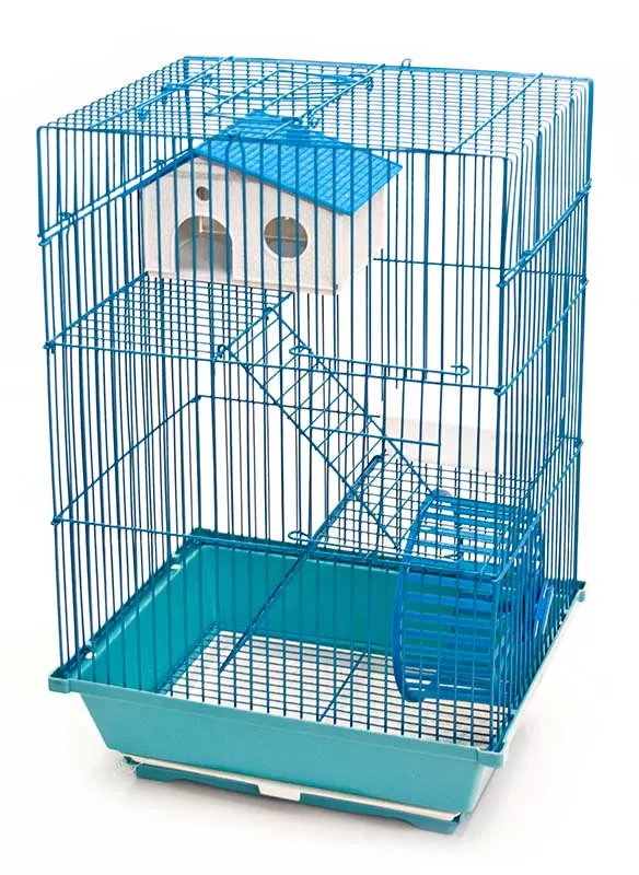 Kavez za hrčka, dimenzija 30x23x47cm, sa tri nivoa povezana merdevinama, točkom i kućicom. Ima rešetku na dnu i puno mesta za kačenje igračaka i opreme.
