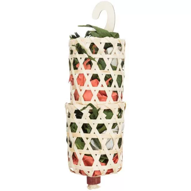 Trixie šarena igračka Natural za kanarince, papagaje i druge ptice napravljena od prirodnih materijala: sisal kanapa, palminog lišća, papira i ljuske. Dugačka je 35cm.