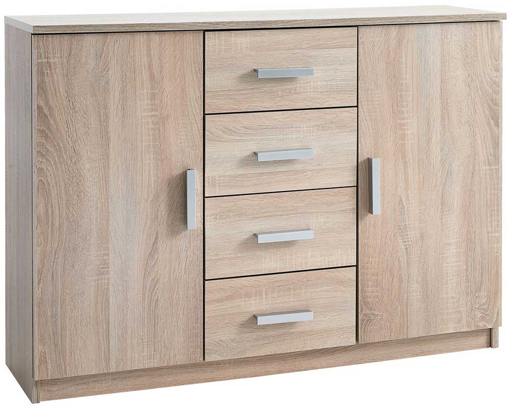 Elegantna komoda širine 118cm i visine 88cm. Komoda ima dva odeljka sa vratima i četiri fioke. Atraktivan dizajn ove komode omogućava da je lako uklopite u svaki enterijer.