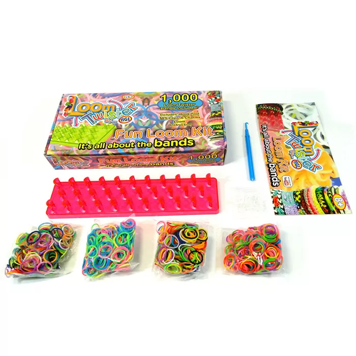 Set sadrži: 2 x 500 gumica, 50 komada S karika, 1 postolje za pletenje, 1 kuku za pletenje, 6 ukrasa, instrukcije
