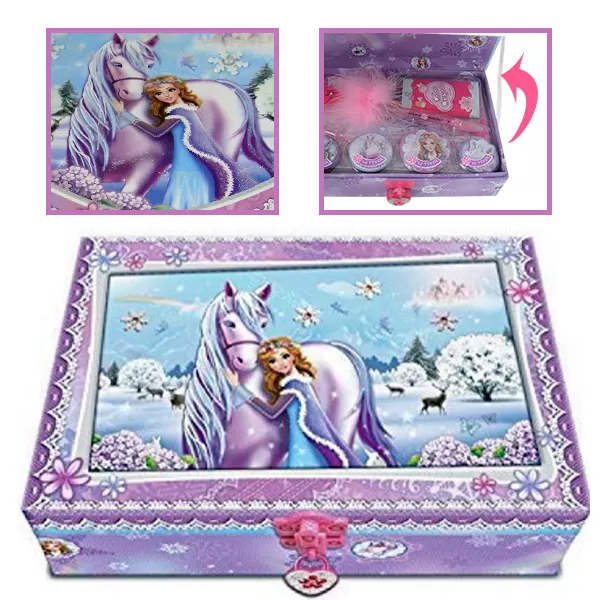 Modna kutija koja sadrži mnoštvo dodataka: voštane boje, olovke, blok za pisanje, 3D stikere. ..