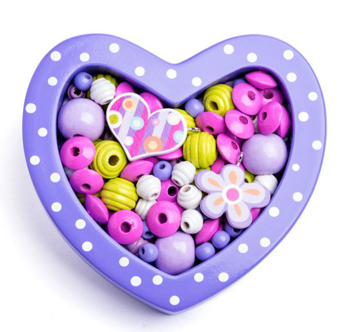 Kutija u obliku ljubičastog srca ti nudi pregršt raznobojnih drvenih perlica za nizanje i pertle, pa tvojoj kreativnosti neće biti ni kraja ni konca! Igračka podstiče finu motoriku i kreativnost.