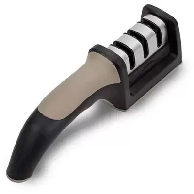 Trostepeni oštrač za noževe i makaze izrađen od omekšane ABS plastike sa podlogom protiv klizanja. Dimenzije: 21 x 9 x 3.5 cm.