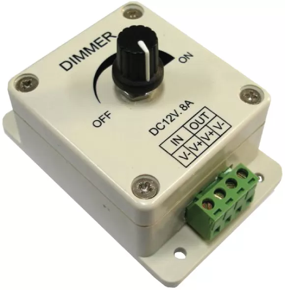 Dimer je uređaj kojim se kontroliše jačina svetlosti, u ovom slučaju svetlosti vaše LED trake. Jačinu je moguće podesiti isključivo ručno, preko potenciometra na samom uređaju.