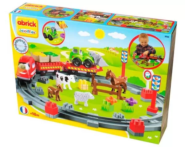 Set sadrži: sklopivi vozić, 4 različite figure životinje: konja, kravu, ovcu i kozu, kocke i dodatke
