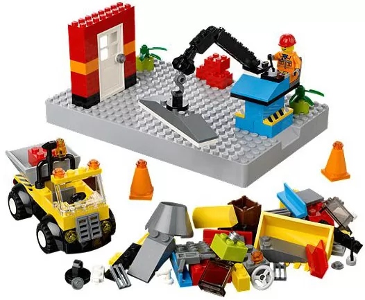 Paket uključuje minifiguru građevinskog radnika, bager, saobraćajne znake, dizalicu, kuću, čekić, biljke, uputstvo za sklapanje
