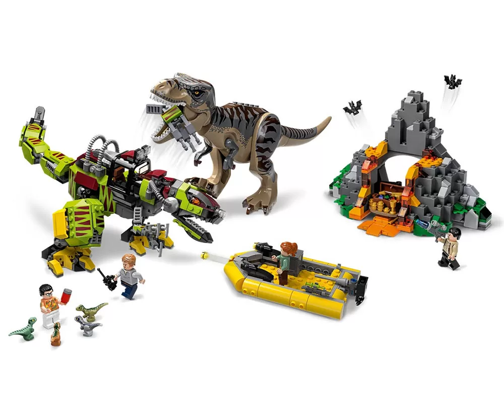 U pakovanju: 4 minifigure (Owen Grady, Claire Dearing, Vic Hoskins, Danny Nedermeyer), 4 figure beba velociraptora (Blue, Delta, Echo, Charlie), 2 figure slepih miševa, T Reksa sa ustima koja se otvaraju i glavom i udovima koji se mogu pomerati, Dinobot sa kokpitom za minifiguru, sa ustima koja se otvaraju i glavom, udovima, kandžama i repom koji se mogu pomerati, naoružani čamac, vulkan sa lavom, koji se može otvoriti, kovčeg s blagom, mnoštvo asesoara, uputstvo za sastavljanje
