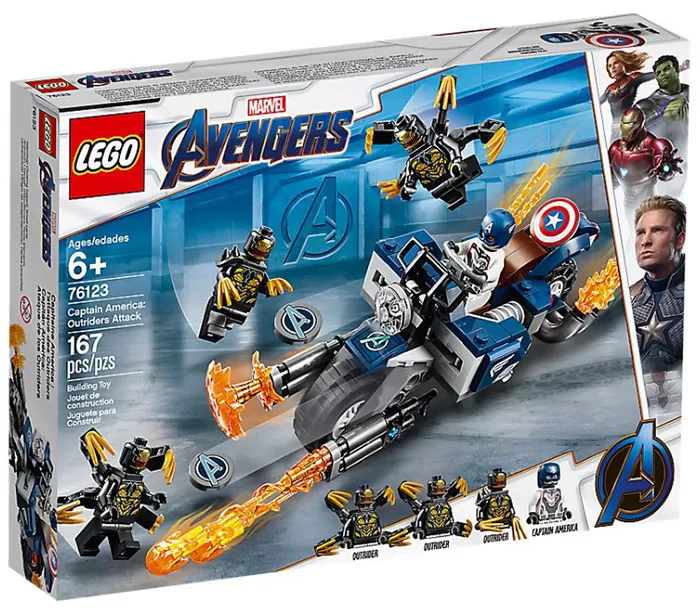 U pakovanju: 4 minifigure (Kapetan Amerika, 3 Outrider-a), motor sa ispaljivačima i projektilima, oružje za minifigure