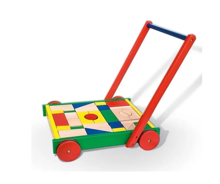 Sadrži drvena kolica i figure geometrijskih oblika - kocke, kvadrata, kupe, valjka, polukruga. Set sadrži 36 delova.