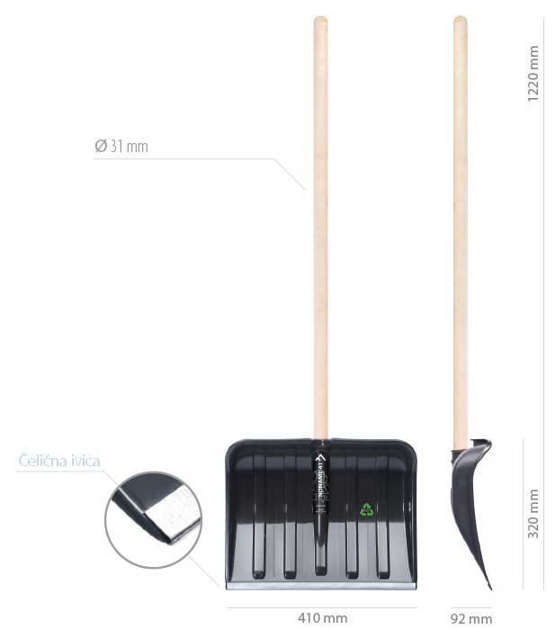 Lopata za sneg izrađena od kvalitetne plastike, sa drvenom drškom i čeličnom ivicom koja sprečava oštećenja. Širina lopate je 41cm.