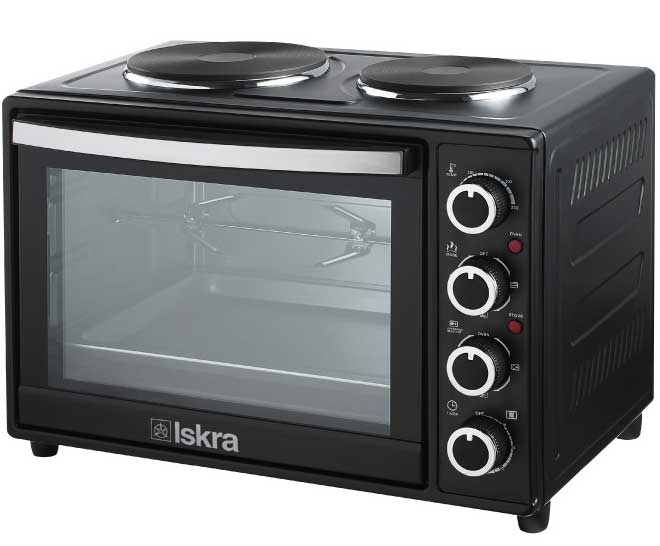 Mini pećnica od 38L sa dva grejača i funkcijom ražnja. Sa gornje strane su dve ringle prečnika 187 i 155mm.