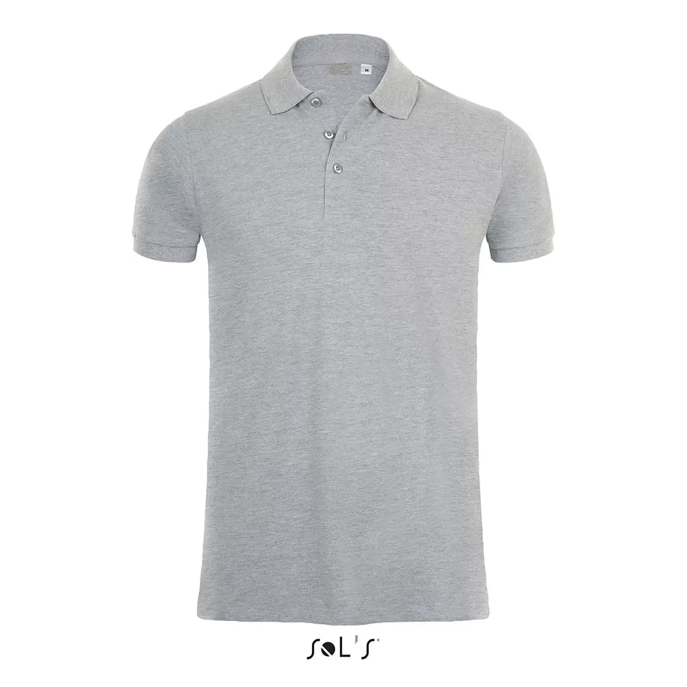 Sols Muška majica Model: Phoenix Men Boja: siva melirana Veličina: S (dužina od ranema do donjeg šava 71.25cm, širina između rukava, preko grudi, u predelu pazuha 49cm) Materijal: PIQUÉ 220, 95% combed Ringspun cotton (češljani pamuk), 5% elastane Kratki rukavi Kragna ojačana trakom oko vrata 3 dugmeta u boji majice Sečena i šivena Prati liniju tela Održavati prema uputstvu sa etikete