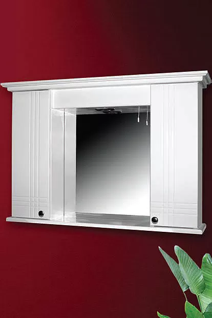 2 police sa strane, ogledalo u sredini, polica ispred ogledala
