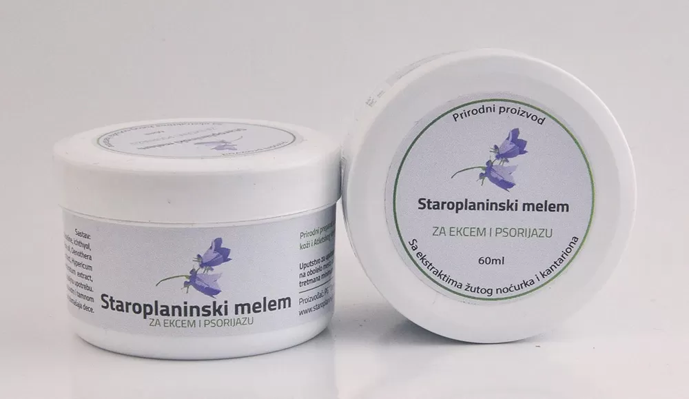 Staroplaninski melem za ekcem i psorijazu je prirodni proizvod sa jedinstvenom formulom koji uspešno otklanja upalne procese na koži. Poseduje veoma jak antiflamatorni, antibakterijski, antimikotički i antiseboreični efekat. Ima blagotvorno dejstvo kod ekcema (dermatitisa koji se manifestuje crvenilom, svrabom i perutanjem kože), i psorijaze, gde nakon mesec dana tretmana dolazi do drastičnog poboljšanja i povlačenja oštećenih i obolelih kožnih lezija.